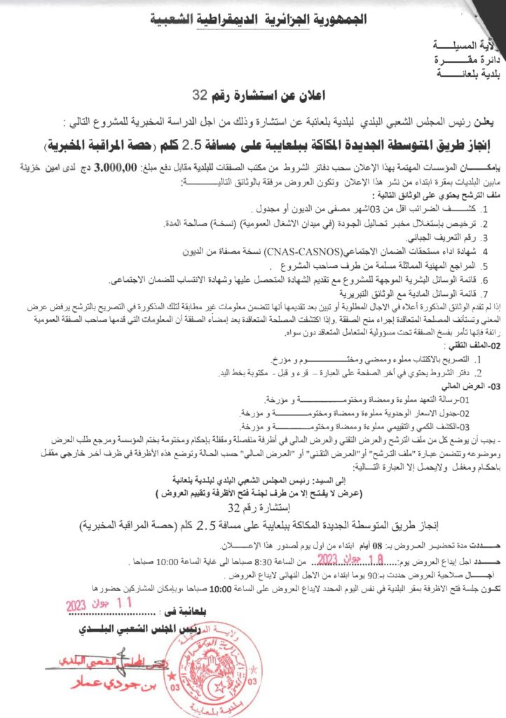 استشارة من أجل الدراسة المخبرية للمشروع التالي: انجاز طريق المتوسطة الجديدة المكاكة على مسافة 2.5 كم (حصة المراقبة المخبرية)12 يونيو، 20230 11 شاركها فيسبوك X مشاركة عبر البريد طباعة