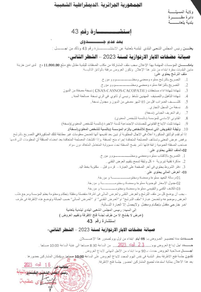 استشارة من أجل: صيانة مضخات الآبار الارتوازية لسنة 2023 الشطر 220 أغسطس، 20230 6 شاركها فيسبوك X مشاركة عبر البريد طباعة
