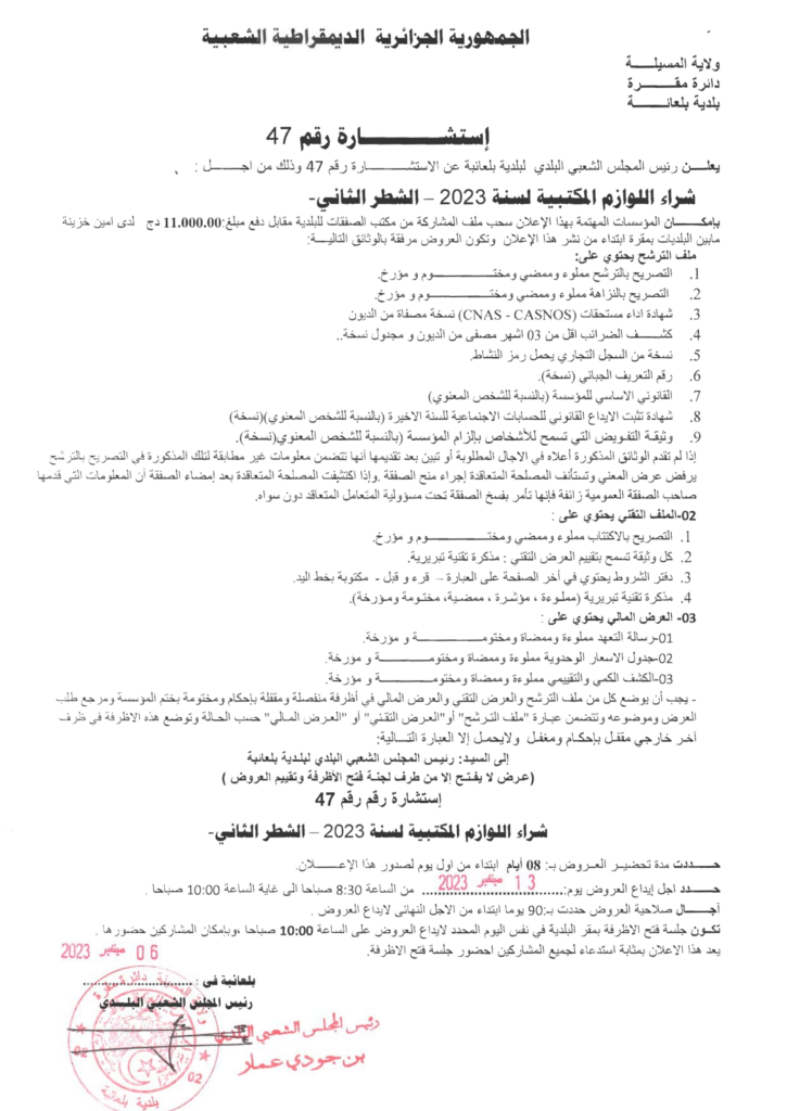 استشارة من أجل: شراء اللوازم المكتبية لسنة 2023 -الشطر 2-6 سبتمبر، 20230 27 شاركها فيسبوك X مشاركة عبر البريد طباعة