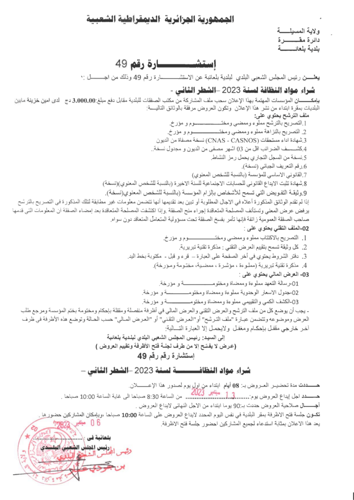 استشارة من أجل: شراء مواد النظافة لسنة 2023 -الشطر 2-6 سبتمبر، 20230 24 شاركها فيسبوك X مشاركة عبر البريد طباعة