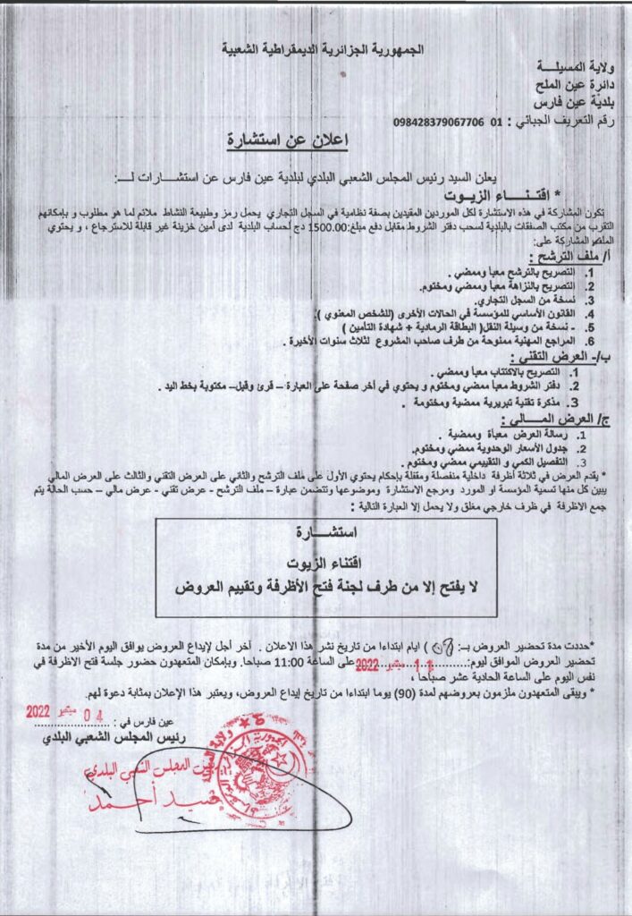 اعلان عن استشارة لــ : اقتناء الزيوتإعلان عن استشارة لـ : اقتناء مادة المازوت4 سبتمبر، 20220 19 شاركها فيسبوك X مشاركة عبر البريد طباعة