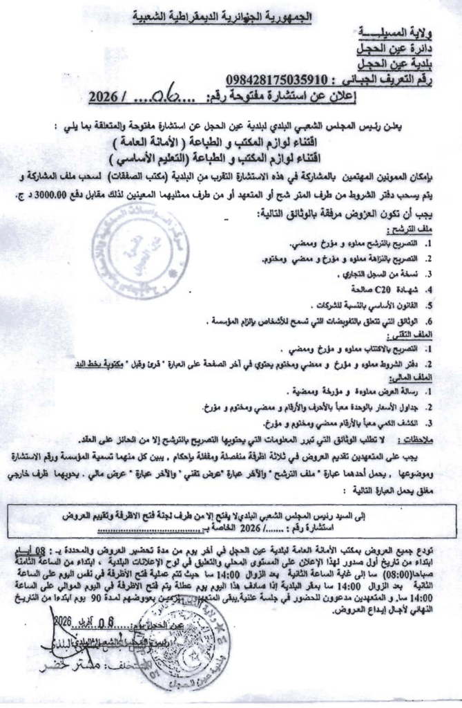 إعلان عن اسشتارة مفتوحة 2026/06 بلدية عين الحجل
