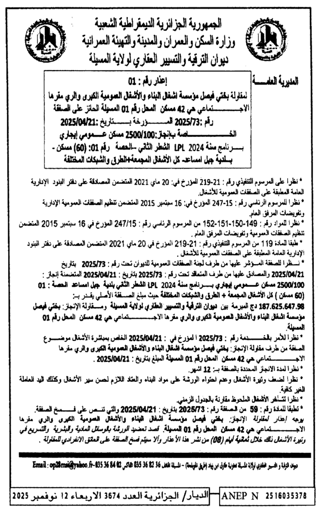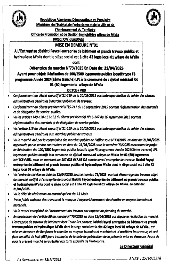 إعلان عن اعذار رقم 01 الخاصة بانجاز 2500/100 مسكن عمومي ايجالاي برنامج 2024 LPL بلدية جبل امساعد/ ديوان الترقية والتسيير العقاري لولاية المسيلة