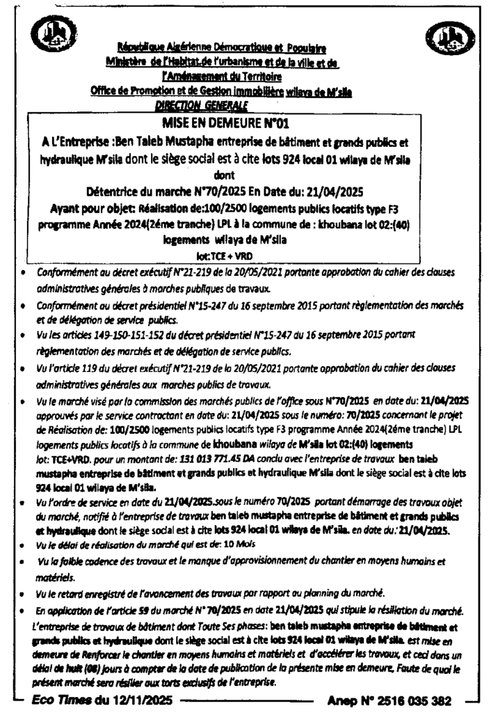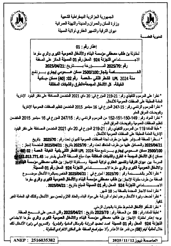 إعلان عن اعذار رقم 01 الخاصة بانجاز 2500/100 مسكن عمومي ايجالاي برنامج 2024 LPL بلدية الخبانة/ ديوان الترقية والتسيير العقاري لولاية المسيلة