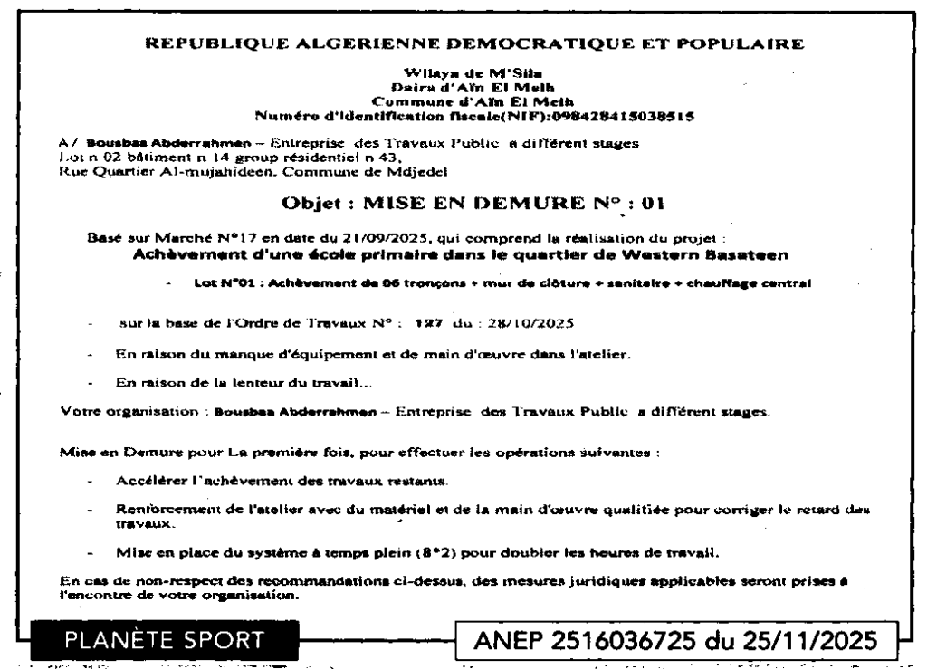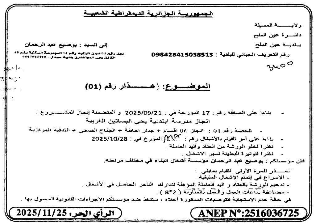 إعلان عن اعذار رقم 01/ بلدية عين الملح
