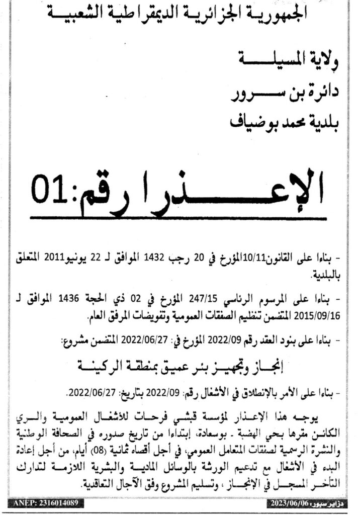 إعلان عن اعذار رقم 01 بلدية محمد بوضياف