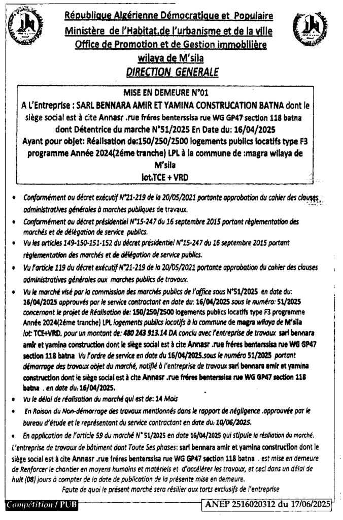 إعلان عن اعذار رقم 01 ديوان الترقية والتسيير العقاري لولاية المسيلة