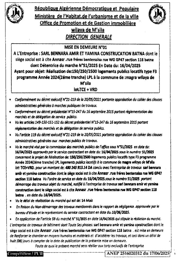 إعلان عن اعذار رقم 01 ديوان الترقية والتسيير العقاري لولاية المسيلة