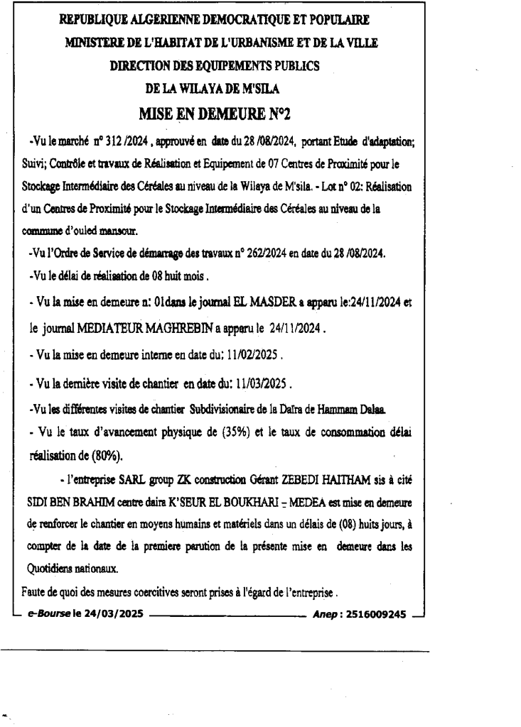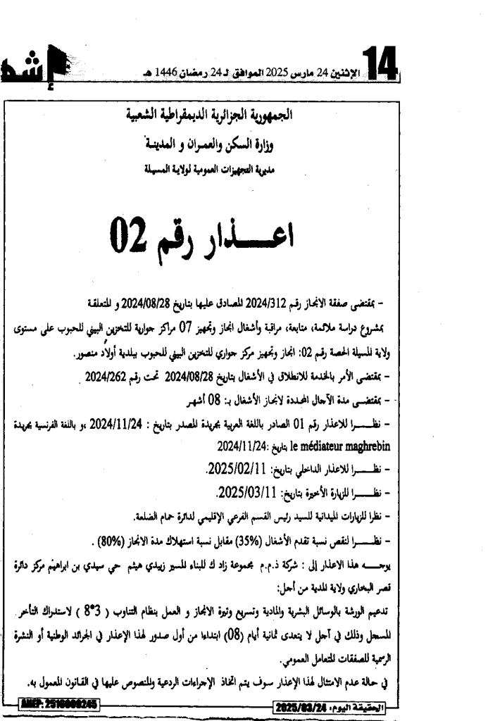 إعلان عن اعذار رقم 02/ مديرية التجهيزات العمومية لولاية المسيلة