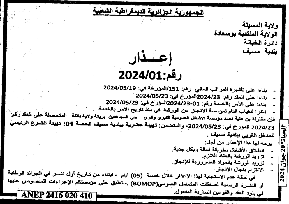 إعلان عن اعذار 2024/01 بلدية مسيف
