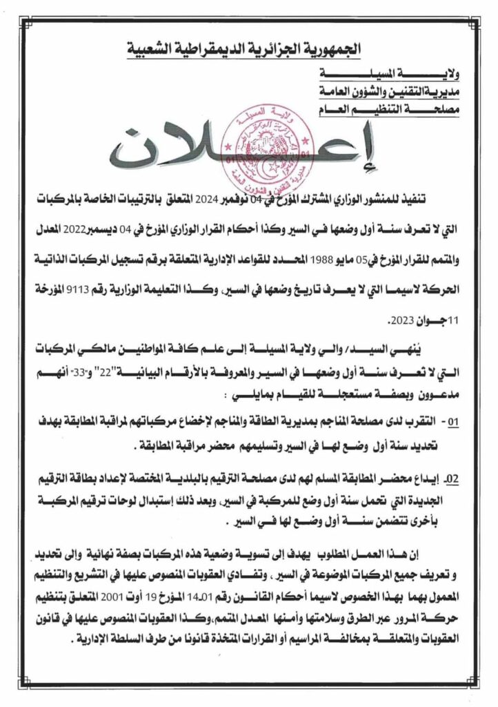 إعلان عن الترتيبات الخاصة بالمركبات التي لا تعرف سنة أول وضعها في السير