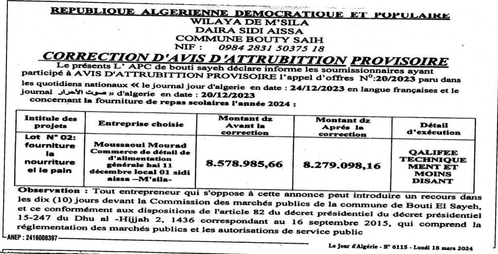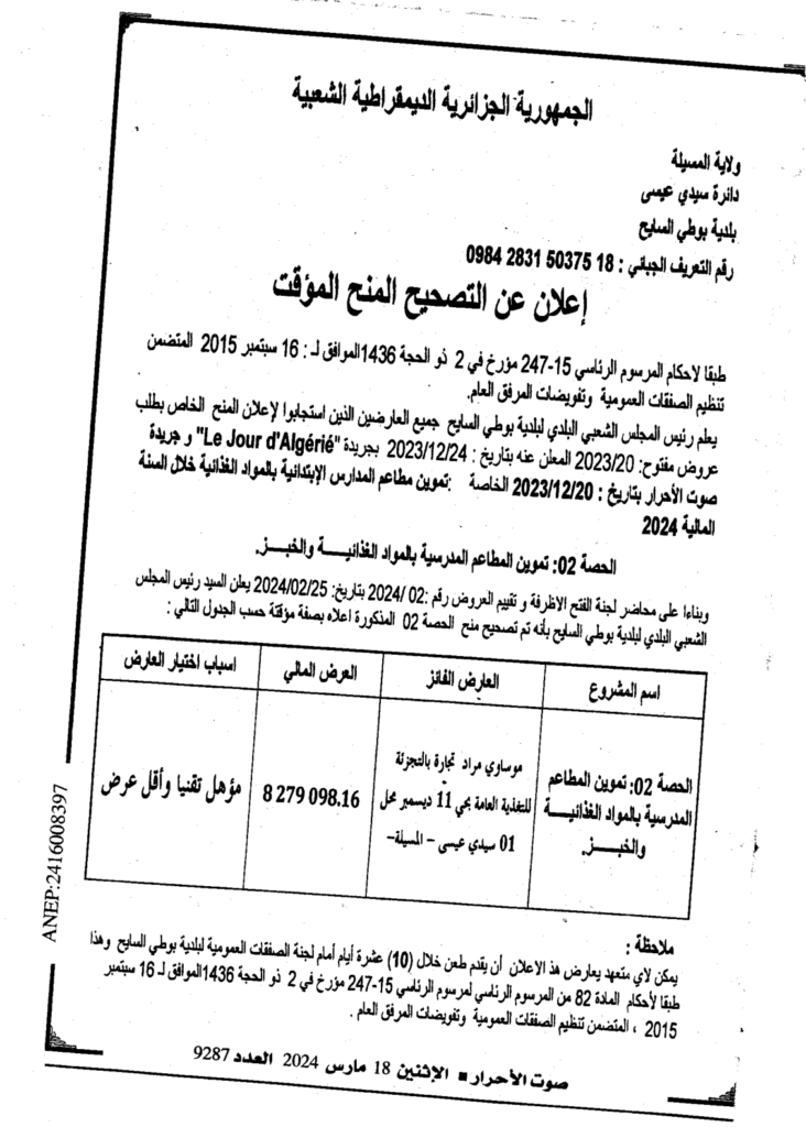 إعلان عن التصحيح المنح المؤقت/ بلدية بوطي السايح
