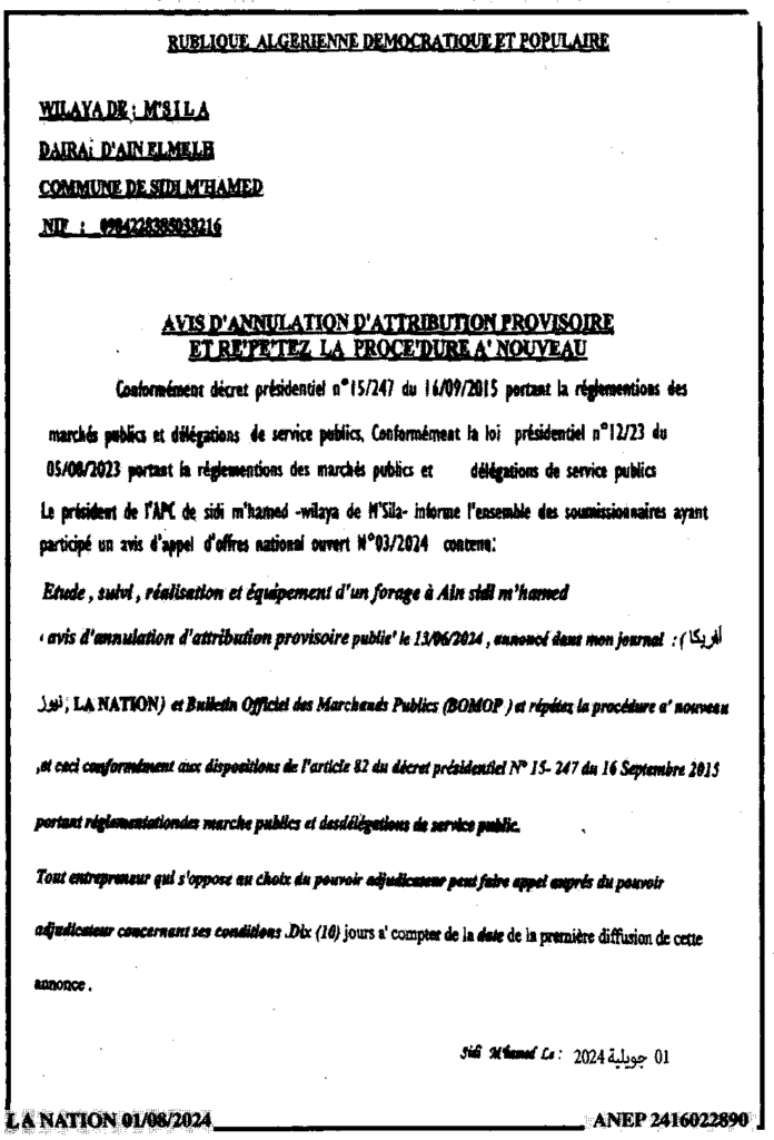 إعلان عن الغاء المنح المؤقت/ بلدية سيدي امحمد