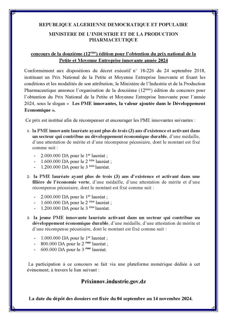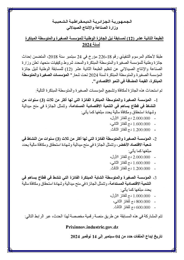 إعلان عن المسابقة الوطنية لنيل الجائزة الوطنية للمؤسسة الصغيرة والمتوسطة المبتكرة لسنة 2024 الطبعة الثانية عشر