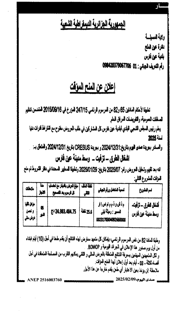 إعلان عن المنح المؤقت أشغال الطرق-تزفيت-وسط مدينة عين فارس/ بلدية عين فارس