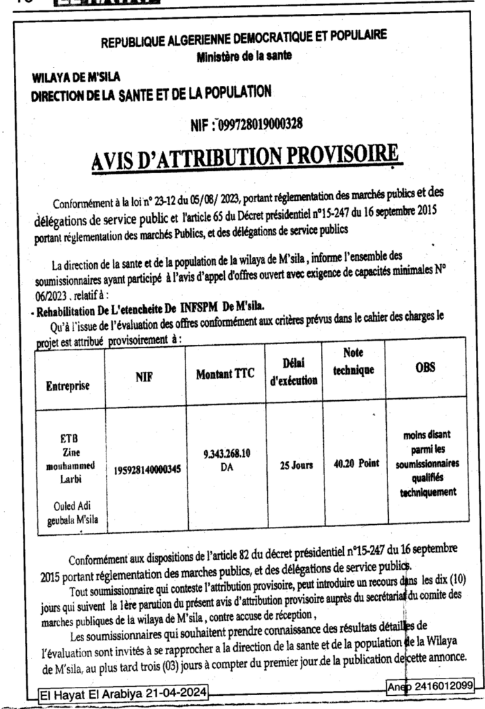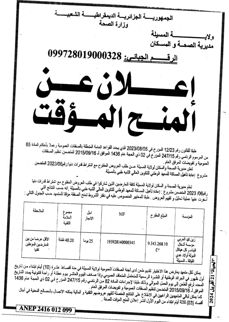 إعلان عن المنح المؤقت إعادة التأهيل المساكة للمعهد الوطني للتكوين العالي والشبه طبي المسيلة/ مديرية الصحة والسكان لولاية المسيلة