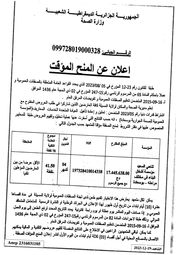 إعلان عن المنح المؤقت: إعادة تأهيل العيادة المتعددة الخدمات المعاريف/ مديرية الصحة