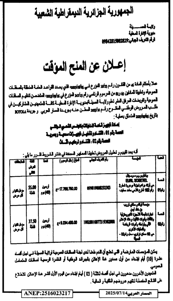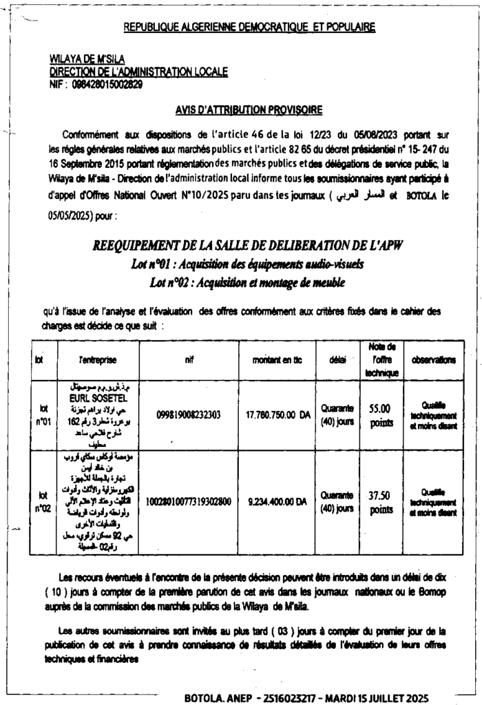 إعلان عن المنح المؤقت إعادة تجهيز قاعة المداولات بالمجلس الشعبي الولائي/ مديرية الإدارة المحلية لولاية المسيلة