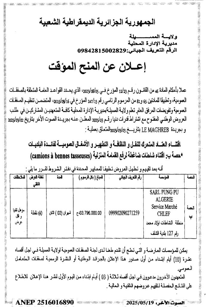 إعلان عن المنح المؤقت اقتناء العتاد المتحرك للنقل والنظافة والتطهير والأشغال العمومية لفائدة البلديات/ مديرية الإدارة المحلية لولاية المسيلة