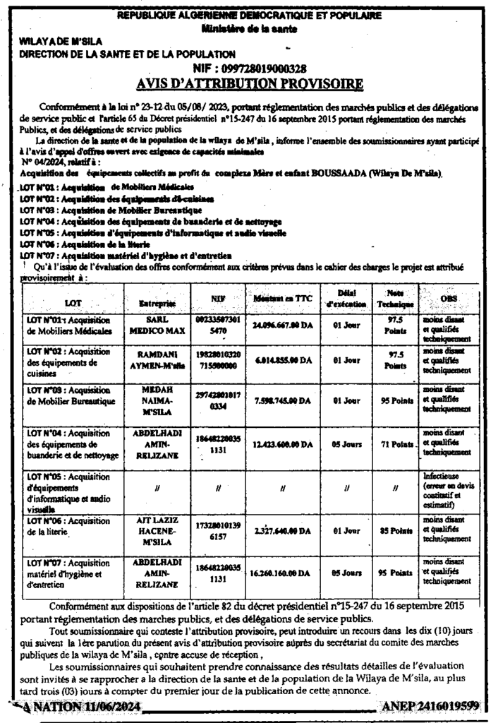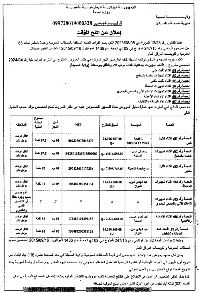 إعلان عن المنح المؤقت اقتناء تجهيزات جماعية لفائدة مركب الأم والطفل ببوسعادة/ مديرية الصحة والسكان لولاية المسيلة