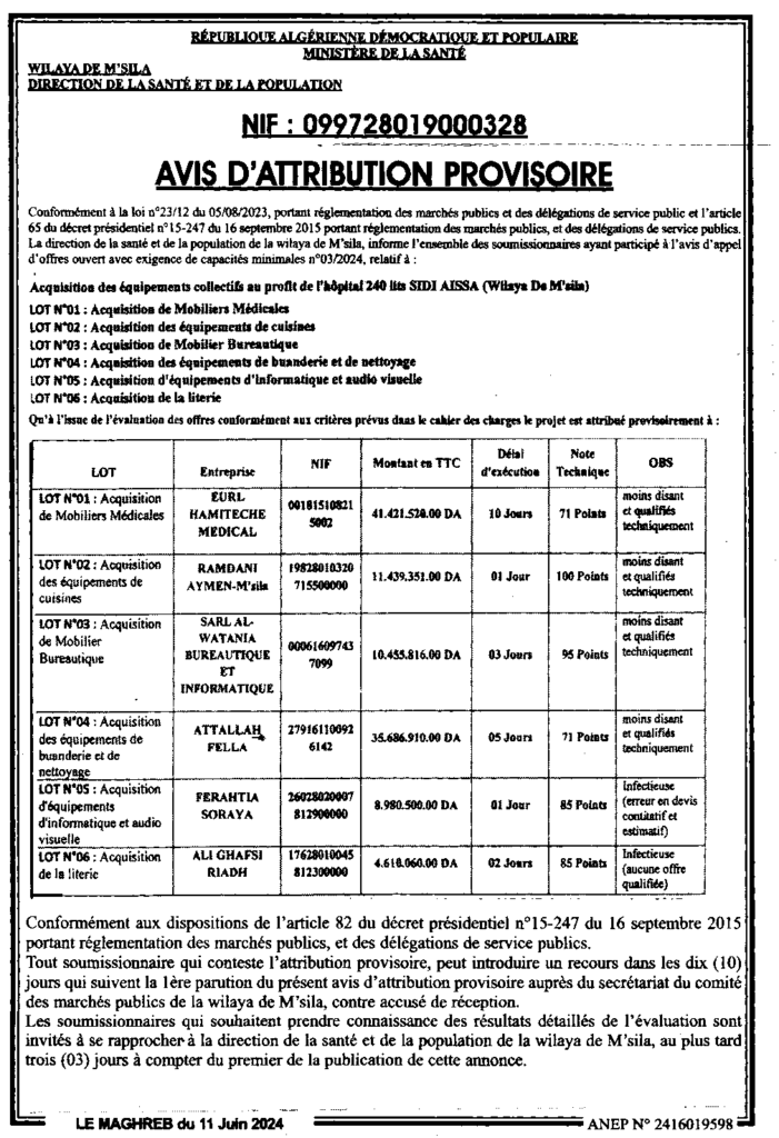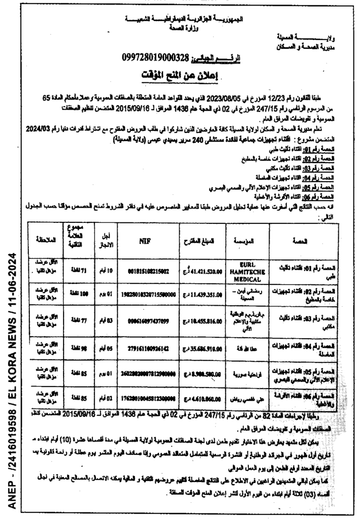 إعلان عن المنح المؤقت اقتناء تجهيزات جماعية لفائدة مستشفى 240 سرير بسيدي عيسى/ مديرية الصحة والسكان لولاية المسيلة