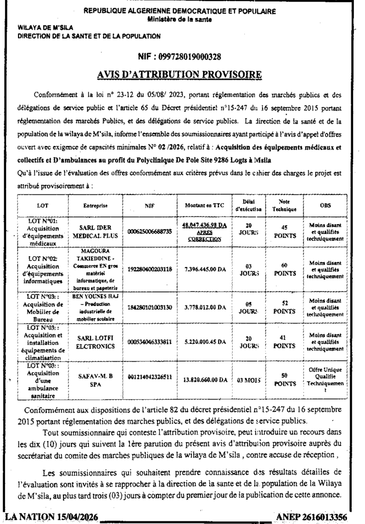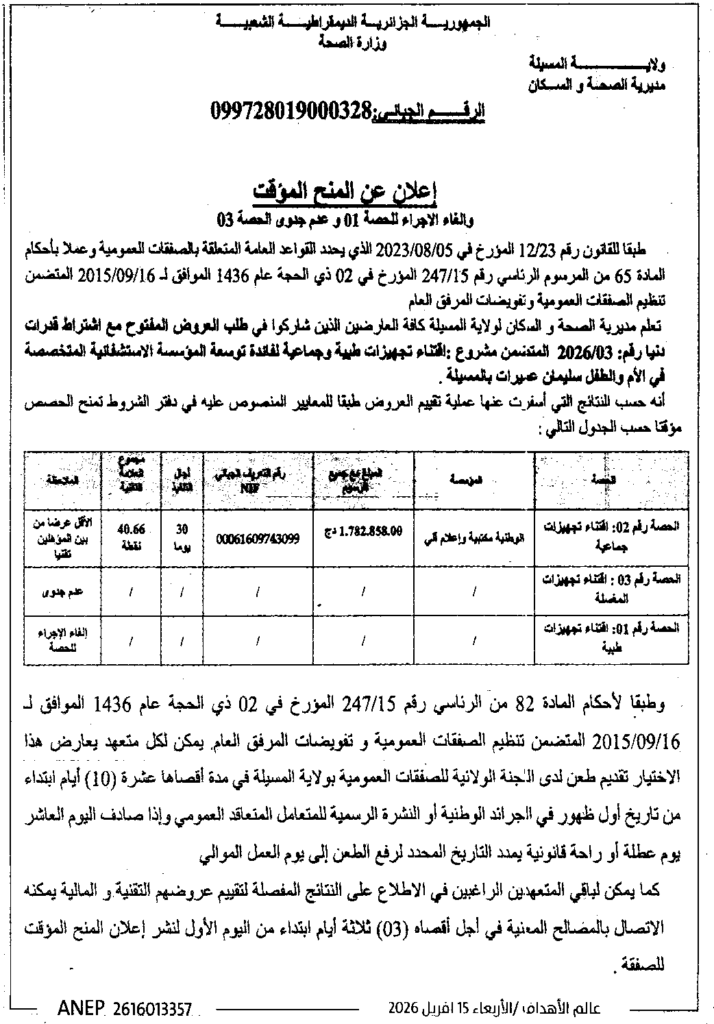 إعلان عن المنح المؤقت اقتناء تجهيزات طبية وجماعية لفائدة المؤسسة الاستشفائية للطفل والأم بالمسيلة/ مديرية الصحة والسكان لولاية المسيلة