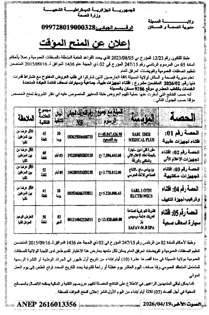 إعلان عن المنح المؤقت اقتناء تجهيزات طبية جماعية وسيارتن اسعاف لفائدة العيادة المتعددة الخدمات بالقطب الحضري/ مديرية الصحة والسكان لولاية المسيلة