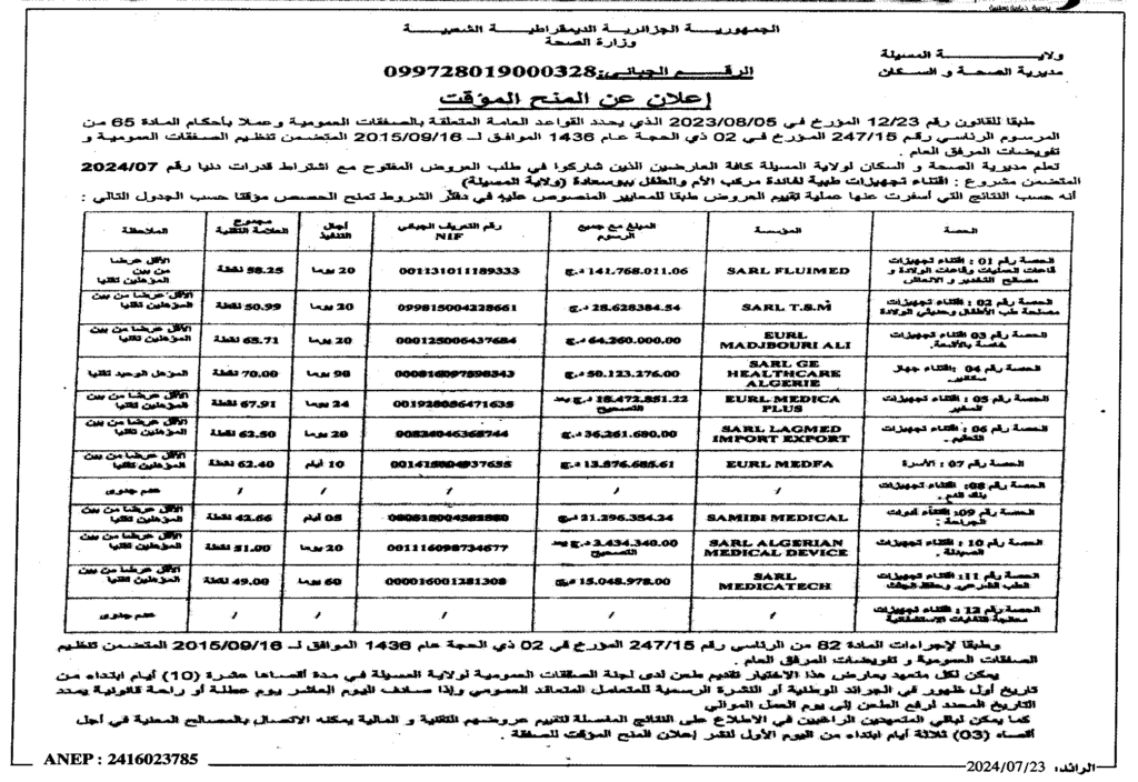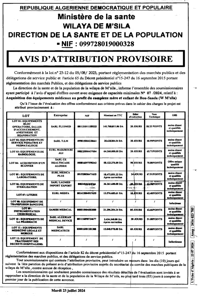 إعلان عن المنح المؤقت اقتناء تجهيزات طبية لفائدة مركب الأم والطفل ببوسعادة/ مديرية الصحة والسكان لولاية المسيلة