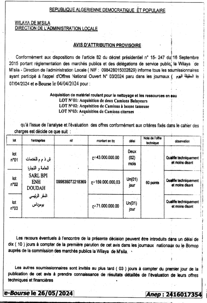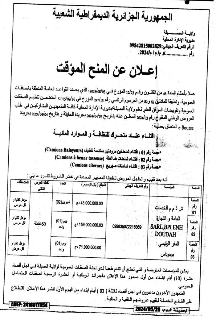 إعلان عن المنح المؤقت اقتناء عتاد متحرك للنظافة والموارد المائية / مديرية الادارة المحلية لولاية المسيلة