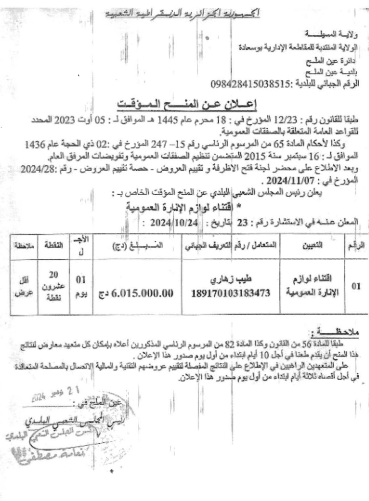 إعلان عن المنح المؤقت اقتناء لوازم الإنارة العمومية/ بلدية عين الملح