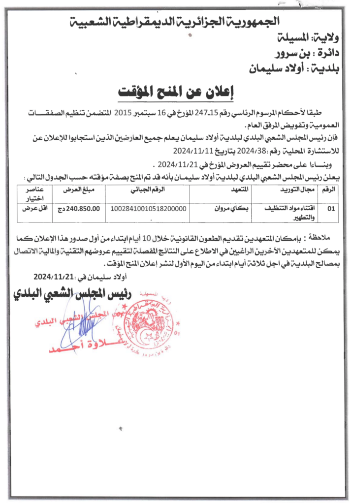 إعلان عن المنح المؤقت اقتناء مواد التنظيف والتطهير/ بلدية أولاد سليمان