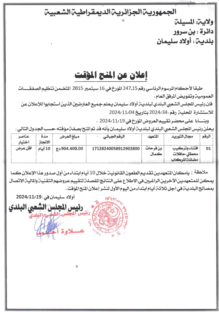 إعلان عن المنح المؤقت اقتناء وتركيب محطتي حافلات مظللة للركاب/ بلدية أولاد سليمان