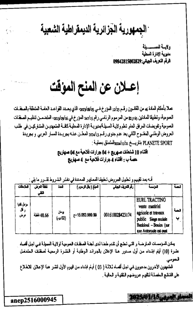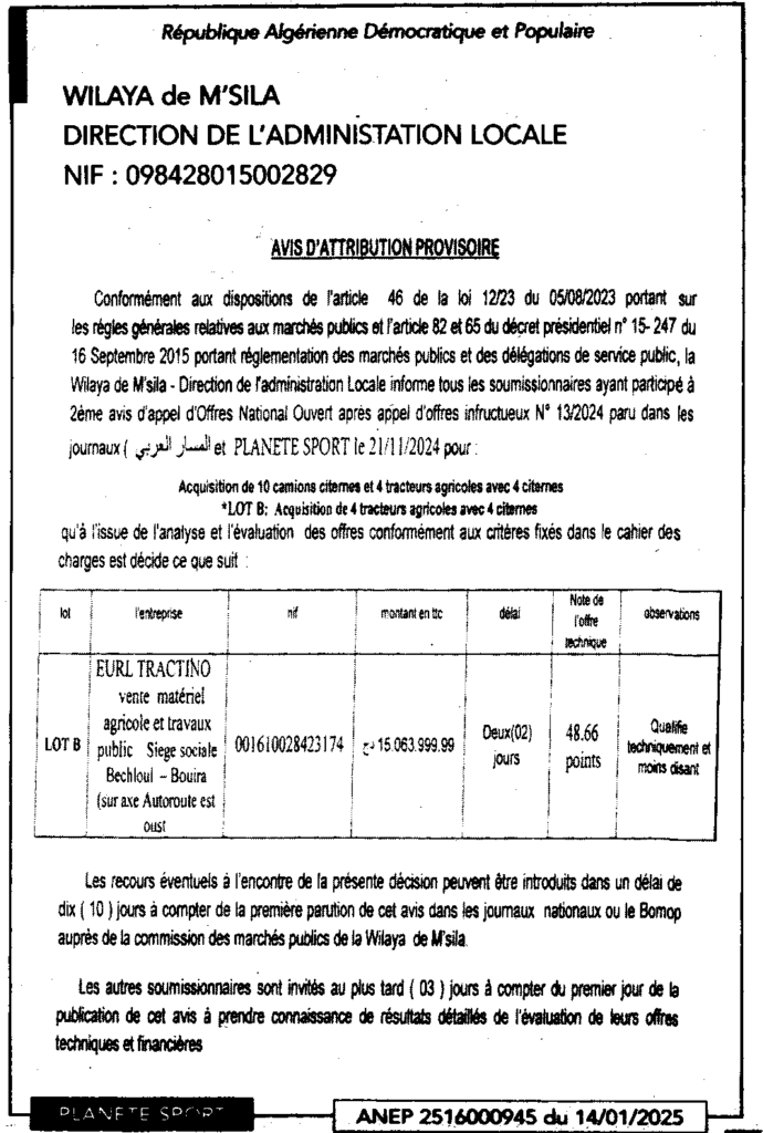 إعلان عن المنح المؤقت اقتناء 10 شاحنات صهريج + 04 جرارات فلاحية مع 04 صهاريج/ مديرية الإدارة المحلية لولاية المسيلة