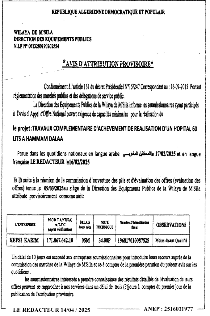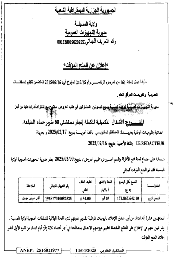 إعلان عن المنح المؤقت الأشغال التكميلية لتكملة انجاز مستشفى 60 سرير حمام الضلعة/ مديرية التجهيزات العمومية لولاية المسيلة