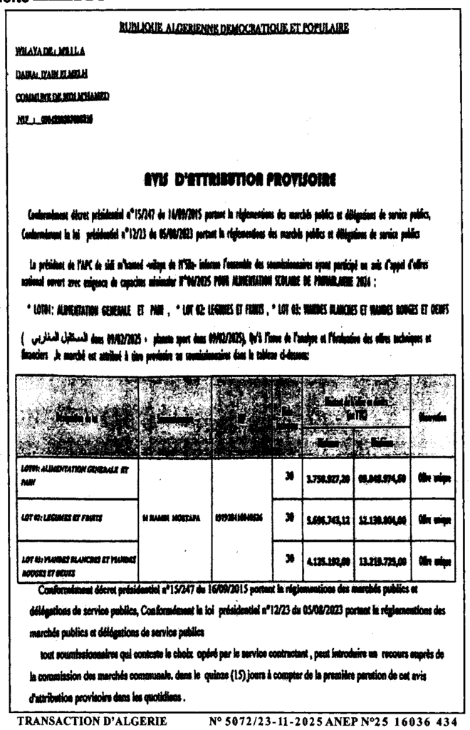 إعلان عن المنح المؤقت التغذية المدرسية للمدارس الابتدائية لسنة 2026/ بلدية سيدي امحمد