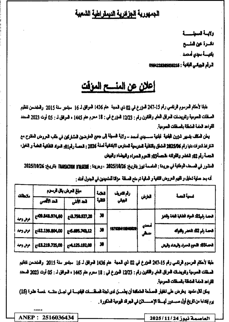 إشعارات بالمنحالصفقات العمومية