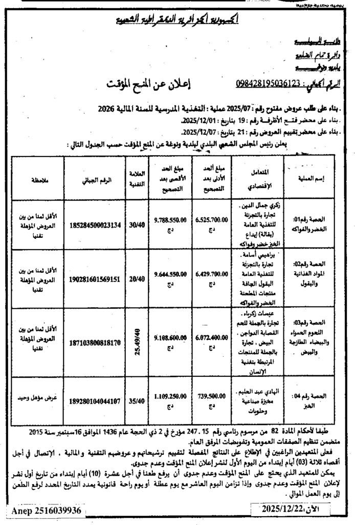 إعلان عن المنح المؤقت التغذية المدرسية للسنة المالية 2026/ بلدية ونوغة