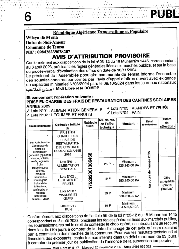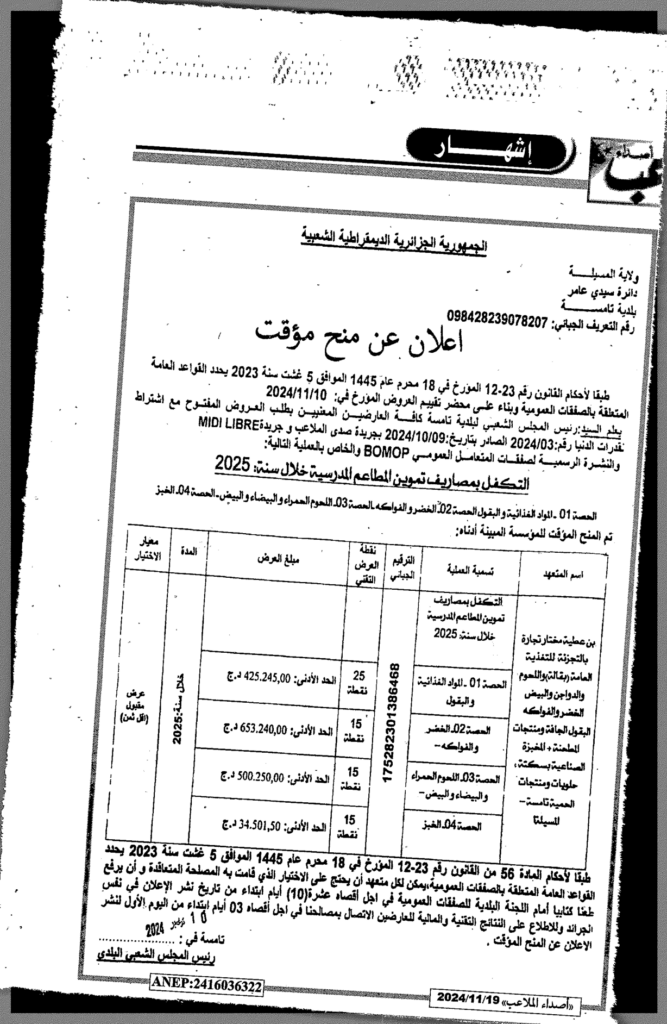 إعلان عن المنح المؤقت التكفل بمصاريف تموين المطاعم المدرسية لسنة 2025/ بلدية تامسة