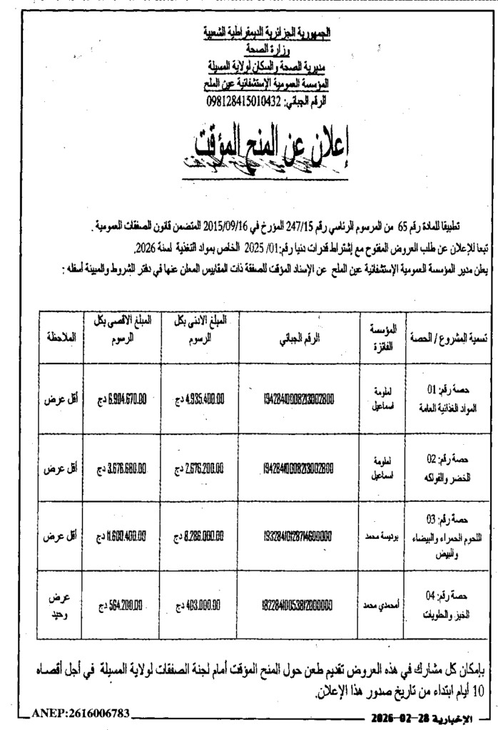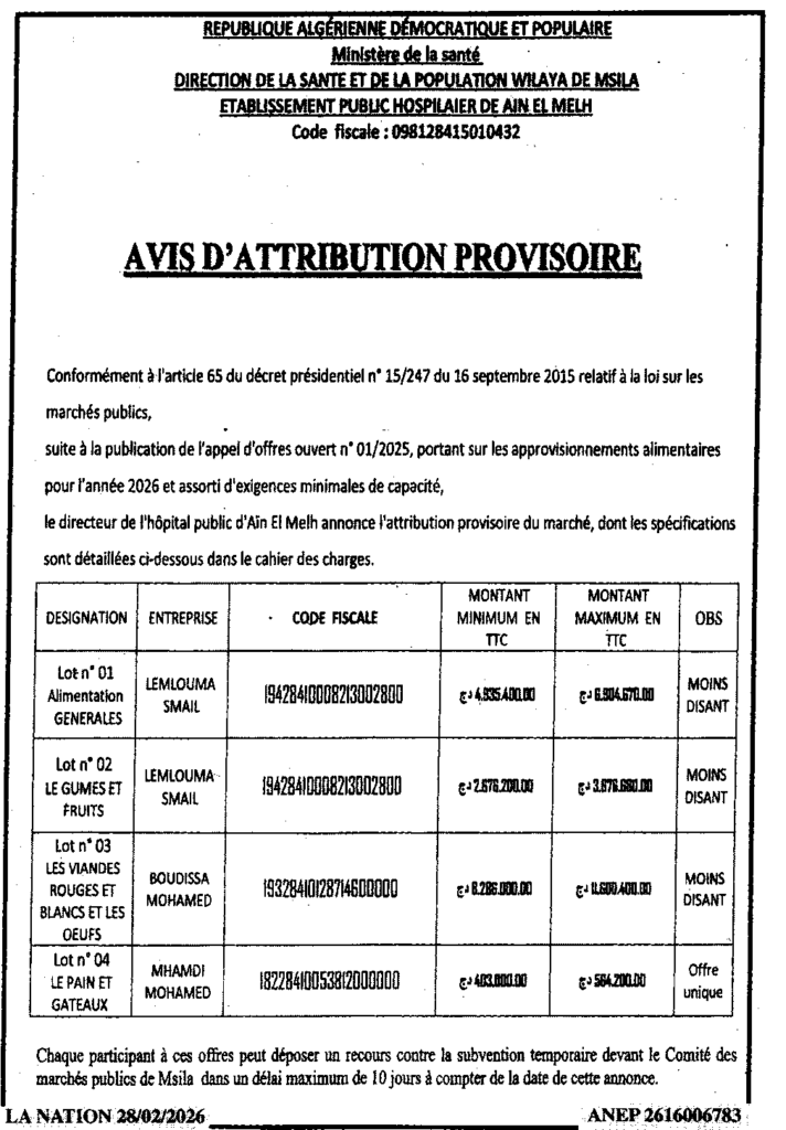 إعلان عن المنح المؤقت الخاص بمواد التغذية 2026/ المؤسسة العمومية الاستشفائية عين الملح