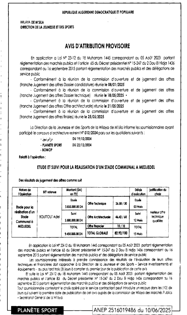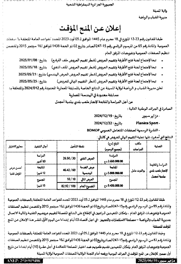 إعلان عن المنح المؤقت الدراسة والمتابعة لانجاز ملعب بلدي ببلدية امجدل/ مديرية الشباب والرياضة لولاية المسيلة