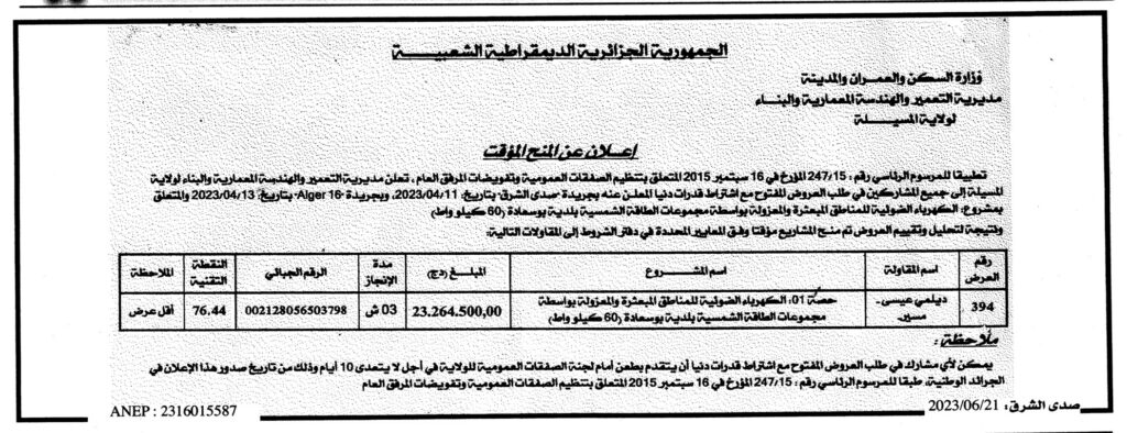 إعلان عن المنح المؤقت: الكهرباء الضوئية للمناطق المبعثرة والمعزولة بلدية بوسعادة/ مديرية التعمير والهندسة المعمارية والبناء