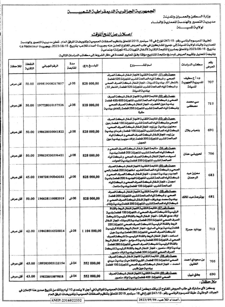 إعلان عن المنح المؤقت: المتابعة التقنية لأشغال التهيئة لـ 40 تجزئة اجتماعية/ مديرية التعمير والهندسة المعمارية والبناء لولاية المسيلة