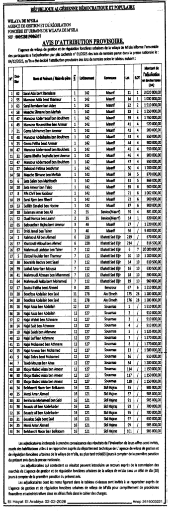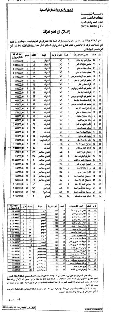 إعلان عن المنح المؤقت / الوكالة الولائية للتسيير التنظيم العقاري الحضري لولاية المسيلة
