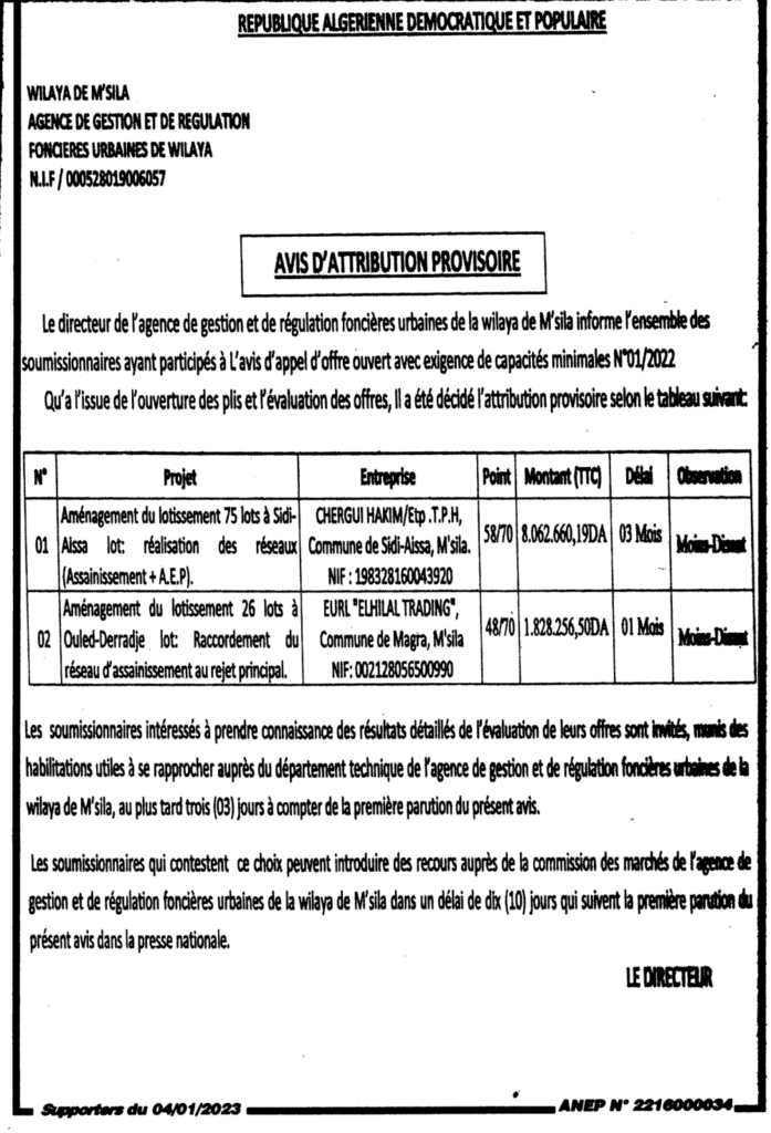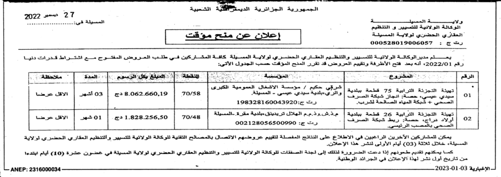 إعلان عن المنح المؤقت/ الوكالة الولائية للتسيير والتنظيم العقاري الحضري لولاية المسيلة