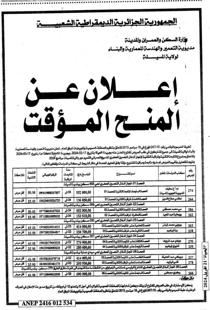 إعلان عن المنح المؤقت انجاز أشغال التحسين الحضري للنسيج العمراني القديم/ مديرية التعمير والهندسة المعما رية والبناء لولاية المسيلة