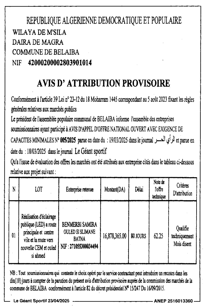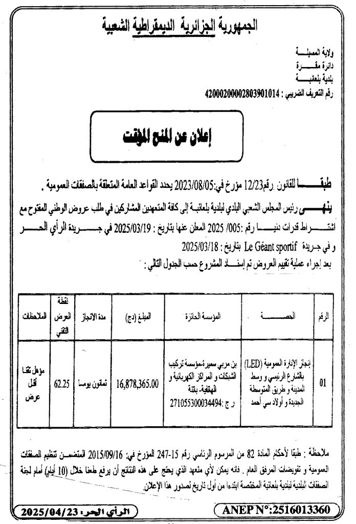 إعلان عن المنح المؤقت انجاز الإنارة العمومية (LED) بالشارع الرئيسي ووسط المدينة وطرق المتوسطة/ بلدية بلعايبة