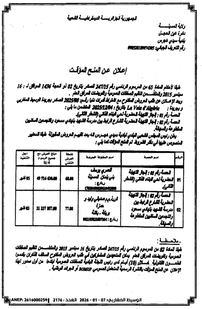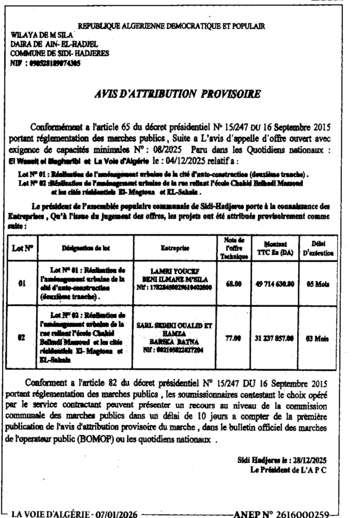إعلان عن المنح المؤقت انجاز التهيئة الحضرية/ بلدية سيدي هجرس