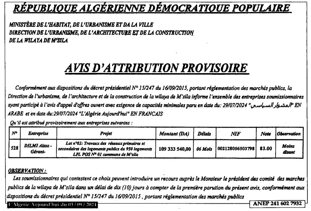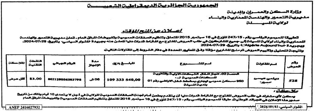 إعلان عن المنح المؤقت انجاز الشبكات الاولية والثانوية للسكنات العمومية/ مديرية التعمير والهندسة المعمارية والبناء لولاية المسيلة