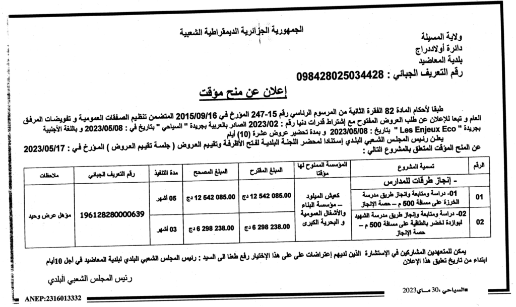 إعلان عن المنح المؤقت: انجاز الطرقات للمدارس/ بلدية المعاضيد