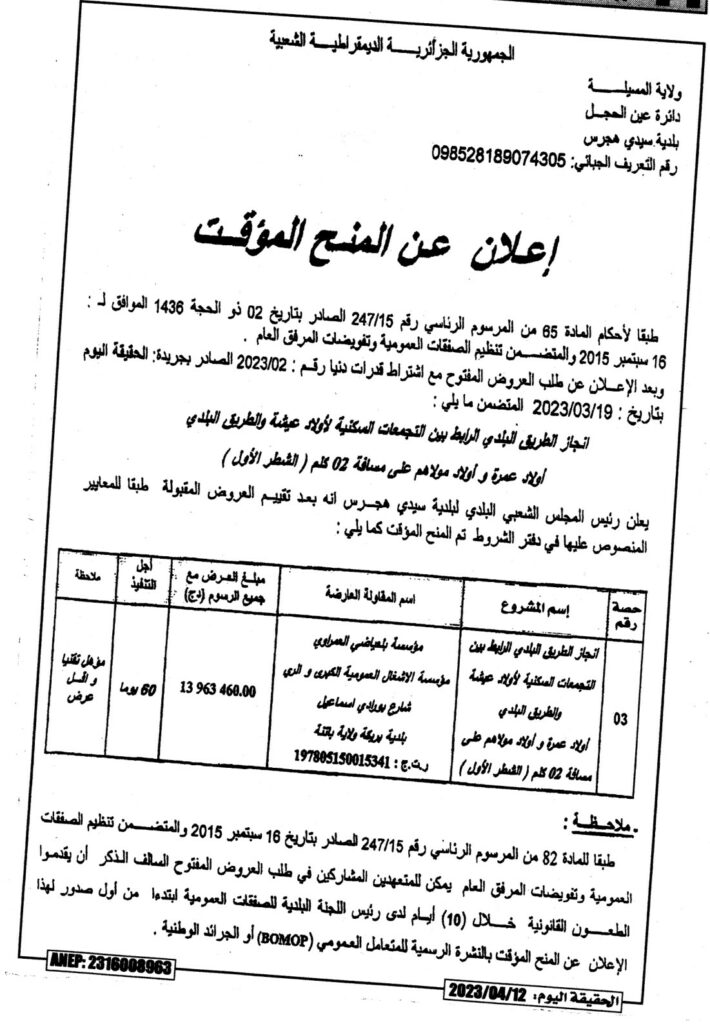إعلان عن المنح المؤقت: انجاز الطريق الرابط بين التجمعات السكنية بلدية سيدي هجرس